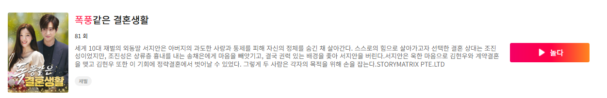 드라마박스 앱 또는 웹사이트에서 ‘폭풍같은 결혼생활’을 검색하면 메인 페이지에서 바로 확인할 수 있어요.