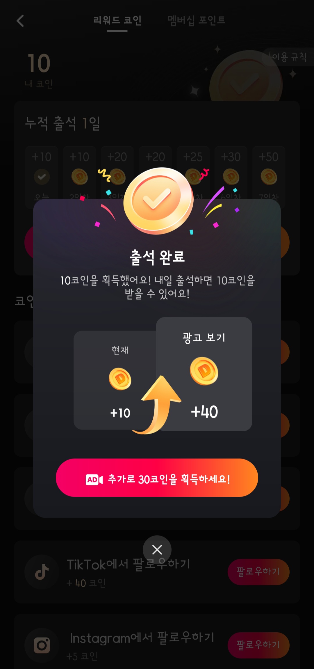 - 미션 수행(예: 영상 공유, 좋아요 누르기)로 코인 획득